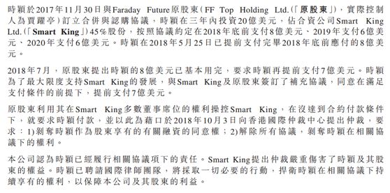 10月7日,恒大健康发布公告称,恒大子公司时颖于2017年11月30日与贾跃亭控制下的FF Top公司签订合并与认购协议,时颖在三年内投资20亿美元,占合资公司Smart King45%股份,按照协议约定在2018年前支付8亿美元、2019年支付6亿美元,2020年支付6亿美元,时颖在2018年5月25日已提前支付8亿美元。