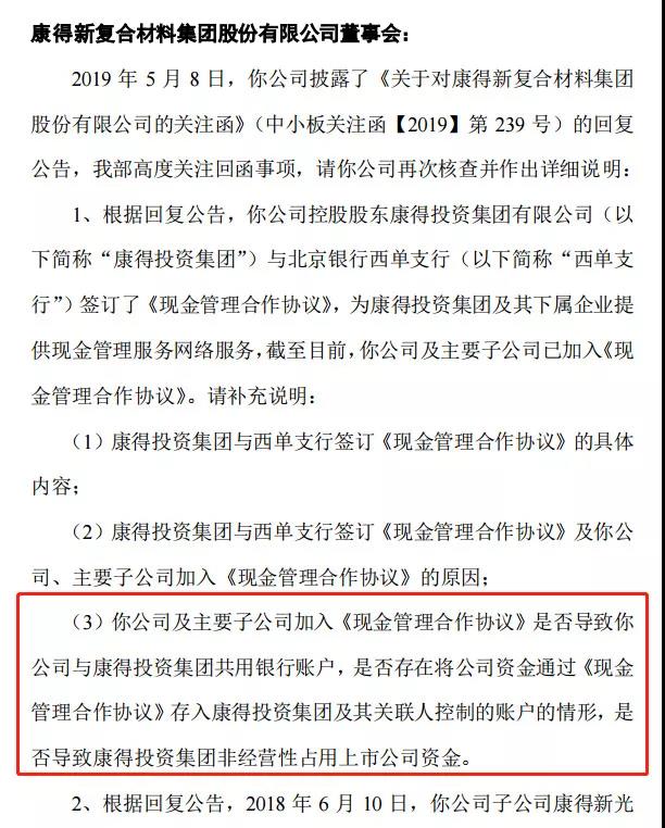 深交所于5月8日又发了关注函,要求*ST康得进一步说明西单支行与康得投资集团签署《现金管理合作协议》的具体内容,以及上述协议是否导致公司与康得投资集团共用银行账户,是否存在将公司资金存入康得投资集团及其关联人控制的账户的情形,是否导致康得投资集团非经营性占用上市公司资金。