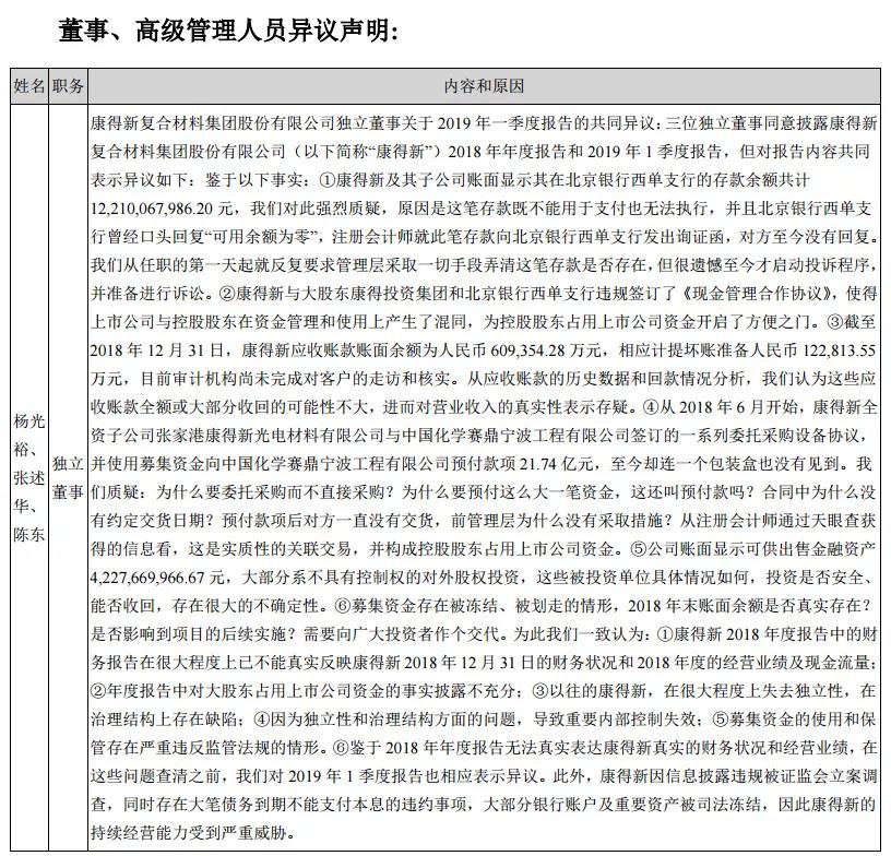 在2019年一季度报告中,康得新的三位独立董事对报告内容共同表示异议,他们的异议如下: