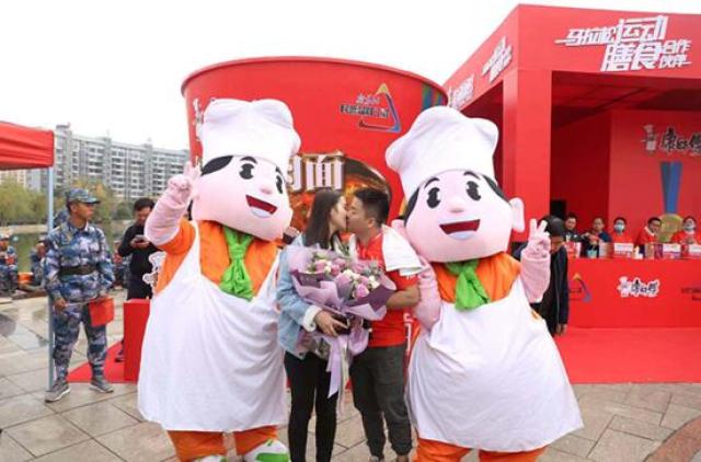一对情侣马拉松选手在康师傅的“支持”下求婚成功。