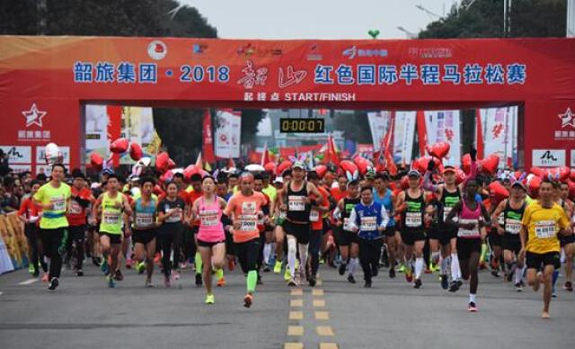 韶山红色国际马拉松赛鸣枪开跑。