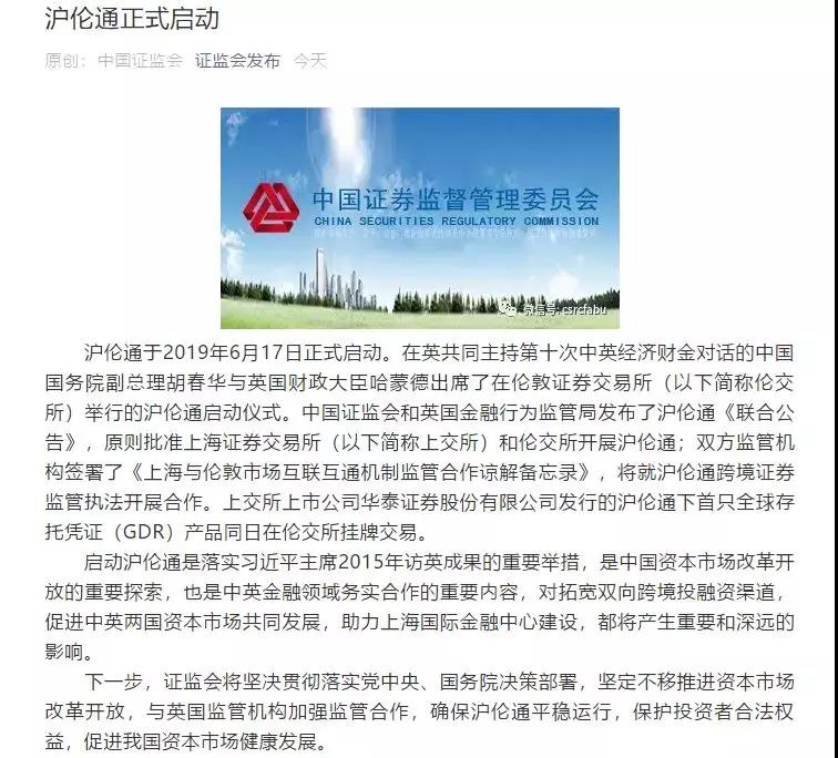 沪伦通于2019年6月17日正式启动。