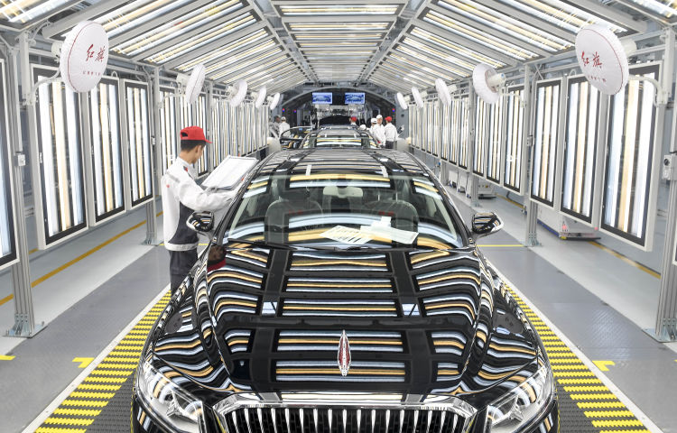 职工在一汽红旗总装车间内进行车辆静检作业。记者 许畅 摄