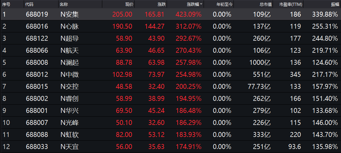 整体来看,25家科创板企业平均涨幅为196.53%,全部实现股价翻倍;平均换手率为57.32%。25只科创板个股成交总额达341.24亿元,其中,中国通号成交额67.58亿元居首。