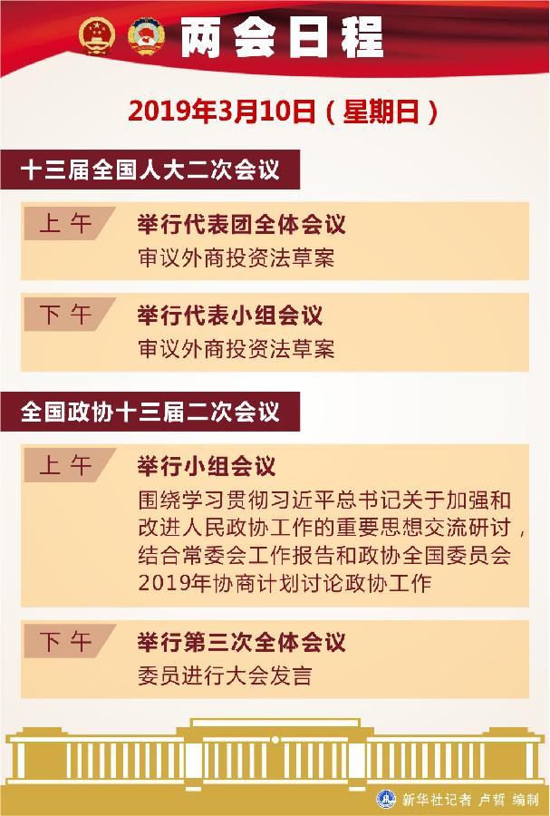 新华社北京3月9日电 十三届全国人大二次会议10日上午举行代表团全体会议,审议外商投资法草案;下午举行代表小组会议,审议外商投资法草案。