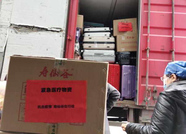 图片说明:寿仙谷捐赠的灵芝孢子粉被装上第二批浙江赴武汉医疗队行李与物资车