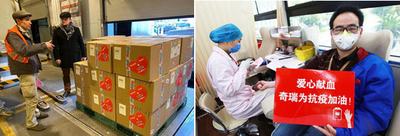 近一个多月来,面对突发而至的新冠肺炎疫情,奇瑞集团通过捐款捐赠、海外采购、生产救护设备、公益服务、爱心献血等多种形式,倾己之力驰援抗疫行动。其中,奇瑞集团捐赠1000万元,提供现金、专用救护车辆以及医疗防护物资等。奇瑞海外团队启动全球采购,从海外采购共计22万件医用物资,交付政府部门用于疫情防控。15名奇瑞出租党员驾驶员自愿报名加入芜湖应急服务车队,在市区公交系统和出租车停运期间,为一线医务人员、老弱病残孕困难群体等提供志愿服务400多次。奇瑞集团108名团员青年分批前往市区献血点,集体献血3万多毫升,支援本地临床用血和湖北紧急用血。在奇瑞瑞弗完成工信部下达的两批负压救护车生产任务后,奇瑞控股集团决定再向武汉、芜湖两地共捐赠6辆瑞弗负压救护车,为武汉加油,为家乡抗疫助力。