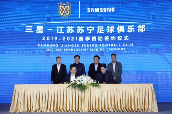 2018年12月6日,苏宁与三星电子于南京苏宁总部正式达成战略合作伙伴关系,并举行了三星电子赞助江苏苏宁足球俱乐部签约仪式。据悉,未来双方将在零售渠道、体育营销等领域展开全面合作,三星电子将在2019至2021赛季成为俱乐部顶级赞助商,并获得球衣胸前广告和背后广告。苏宁将士将身披印有“三星(Samsung)” 字样的全新战袍,征战接下来三个赛季的所有赛事。