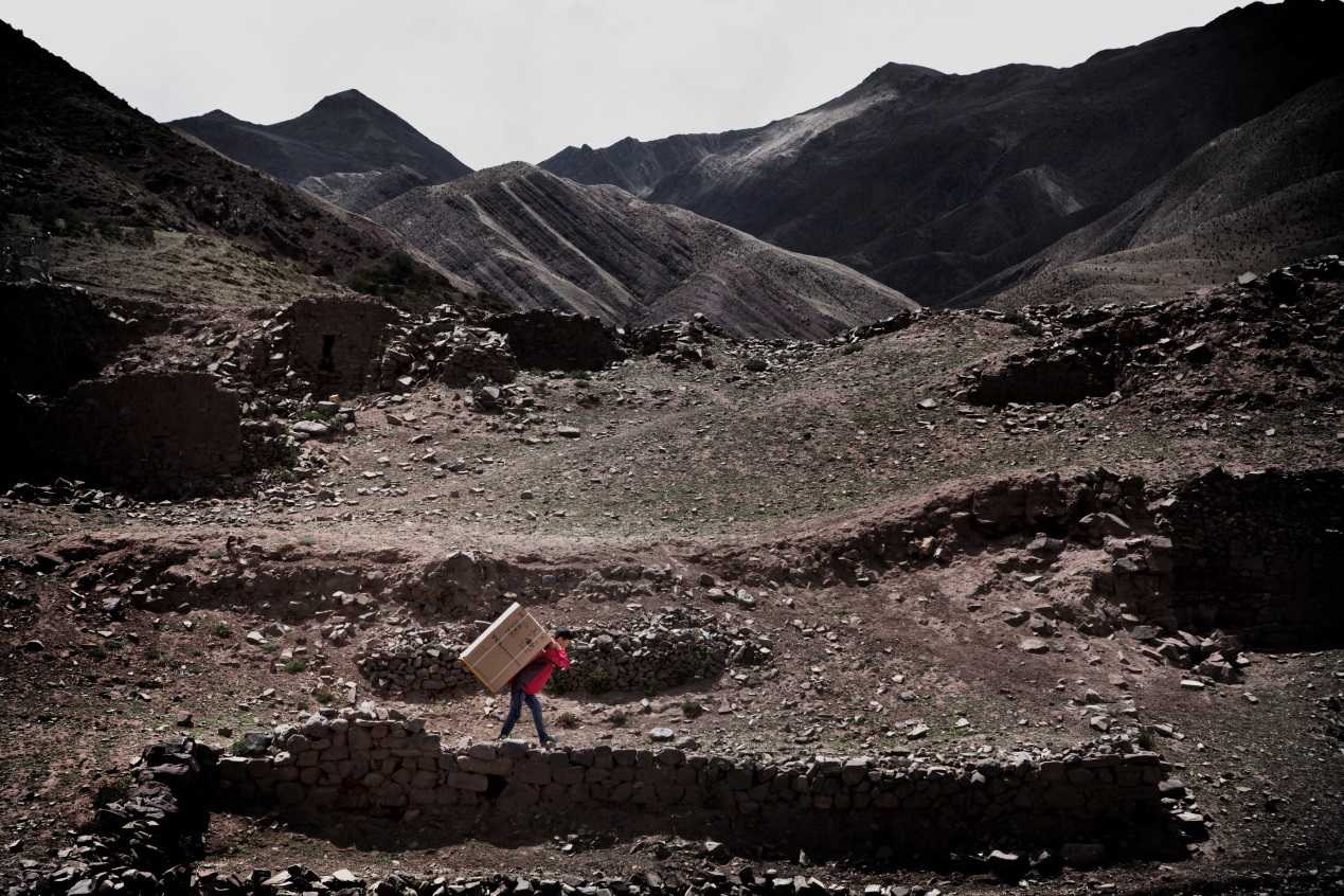 京东物流快递员扎西平措背着货物走在通往村子的路上。