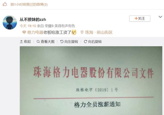 然而别人家的公司格力电器又亮了。1月8日晚,格力电器2019年“一号文”刷爆朋友圈,《格力全员涨薪通知》(珠格电字〔2019〕1号)显示,自2019年元月起,格力电器根据不同岗位给予员工薪资调整,总增加薪酬在10亿元以内。