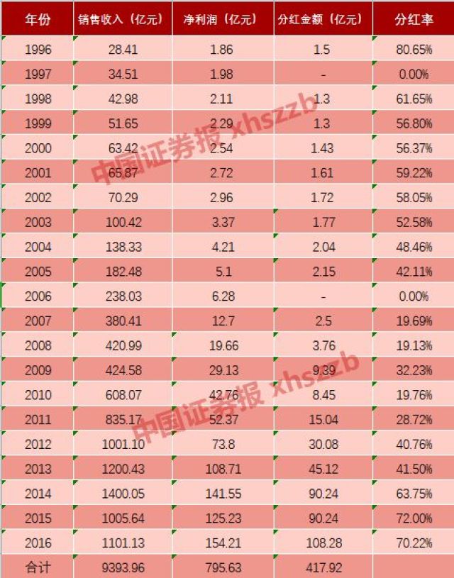 格力电器1996年-2016年分红及盈利情况