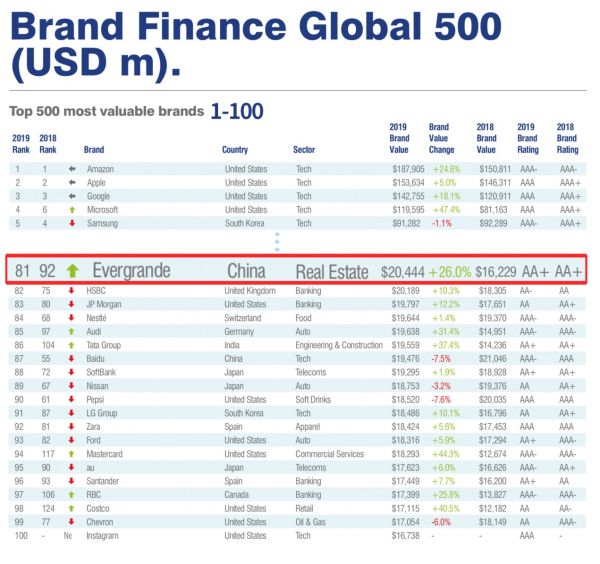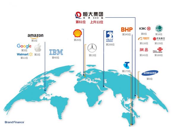 近日,全球知名品牌价值评估机构Brand Finance发布“2019年全球最具价值品牌500强”报告。中国品牌表现强劲,上榜品牌达77家,品牌总价值首次突破1万亿美元,其中恒大集团排名大幅跃升,位列榜单81位,成为中国品牌20强。
