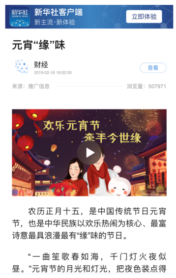 新春伊始,伴随着元宵节的火树银花,今世缘《中国节•中国缘》系列短片继“春节篇”获得众多网友点赞后,“元宵篇”于2月18日在全国主流全媒体传播平台温情亮相。这是今世缘作为民族品牌大力弘扬家国情怀的自觉行动,也是推进传统节日传承的积极实践。