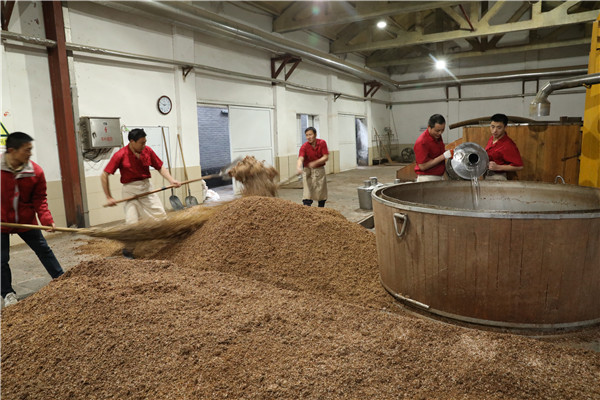 在古法酿酒工艺中,工人们需要往甑桶里灌入水,准备蒸馏酒体。(席航飞 摄)