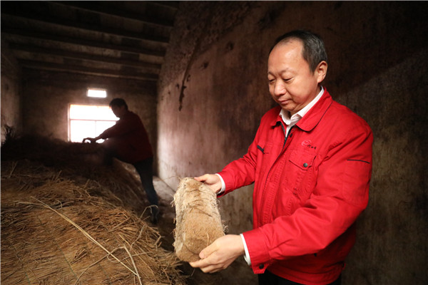 培养房里,吴建峰拿起一块曲,仔细观察曲身霉菌。(席航飞 摄)。