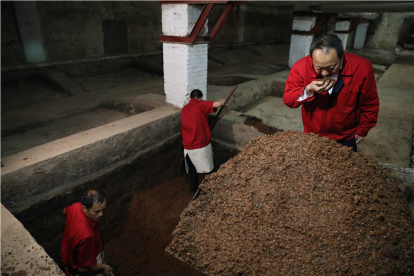 工人们在高沟老窖里挖出酒醅,吴建峰(右)在细细品嗅酒醅的香气。(席航飞 摄)