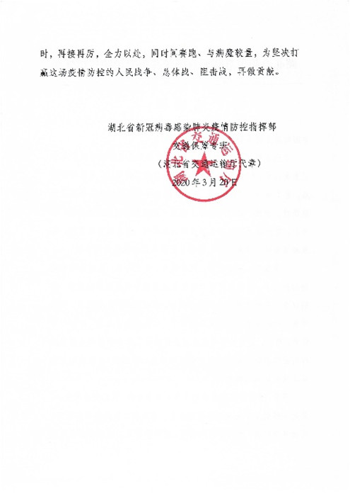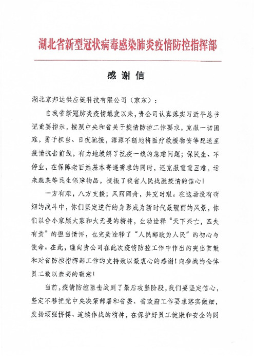 3月21日,湖北省新型冠状病毒感染肺炎疫情防控指挥部给京东集团发来感谢信,对京东在整个疫情防控工作中,克服一切困难,勇于担当、日夜驰援的工作给予肯定。感谢信称,京东同时还在保民生、不停业方面做出了很大贡献,在保障老百姓基本寄递需求的同时,克服重重困难,运来蔬菜等民生保障物品,提振了湖北省人民战胜疫情的信心!感谢信中称赞21万京东人舍小家顾大家与大无畏的精神,生动诠释“天下兴亡,匹夫有责”的担当情怀,并向京东全体工作人员的突出贡献致以最衷心的感谢和最崇高的敬意!