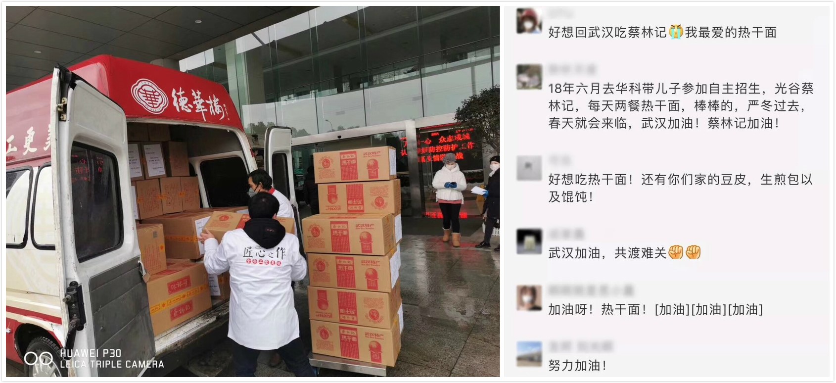 (左)蔡林记为援鄂医疗队捐赠热干面,(右)消费者为蔡林记加油打气。
