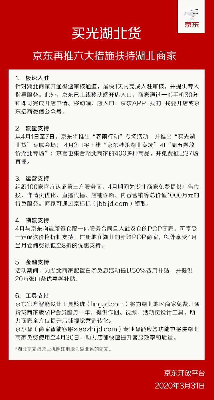 运营支持方面,京东将组织100家官方认证第三方服务商,为湖北商家免费提供总价值1000万元的各项运营服务。