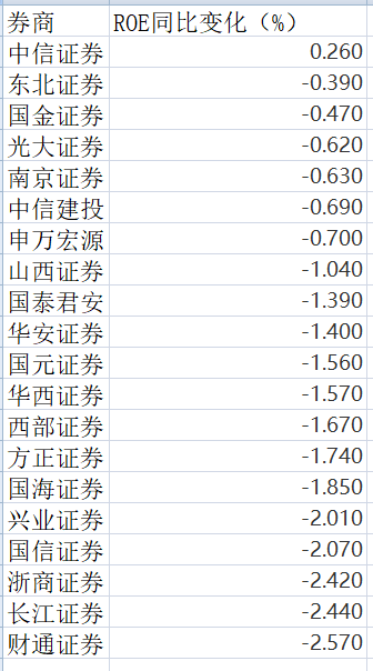 除此以外,在统计比较加权平均净资产收益率(ROE)的同比变化后,可以得出仅中信证券一家较去年同比出现增长(图3)。而在ROE下降的券商中,不难看出减幅较大的是中小型券商。