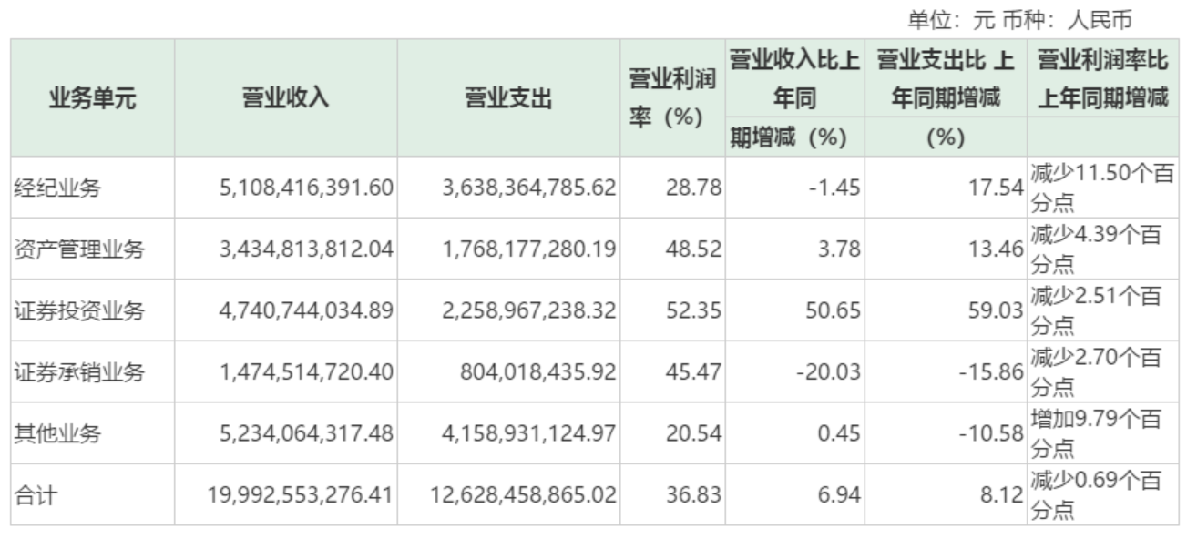 业绩亮眼的因素有哪些?中国财富网通过对21家券商主营业务市场份额进行比较发现,中信证券各主营业务保持市场前列。其中,股权融资主承销规模人民币912亿元,市场份额12.94%,排名行业第一;债券主承销规模人民币2,624亿元,市场份额4.65%,排名同业第一;境内并购重组(证监会通道类业务)交易规模人民币224亿元,市场份额8.16%,排名行业第三;代理股票基金交易总量(不含场内货币基金交易量)市场份额6.00%;本公司资产管理规模人民币1.53万亿元,市场份额10.30%,其中主动管理规模人民币5,832亿元,均排名行业第一;融资融券余额人民币647亿元,市场份额7.04%,排名行业第一。通过观察中信证券2018年上半年主营业务收入(图4)可以看出,其证券投资业务的营业收入比上年同期增长50.65%,是最大“功臣”。