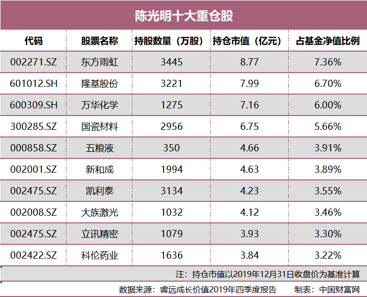 根据睿远成长价值去年的四季报,陈光明最钟爱的10只股票分别为东方雨虹、隆基股份、万华化学、国瓷材料、五粮液、新和成、凯利泰、大族激光、立讯精密、科伦药业。