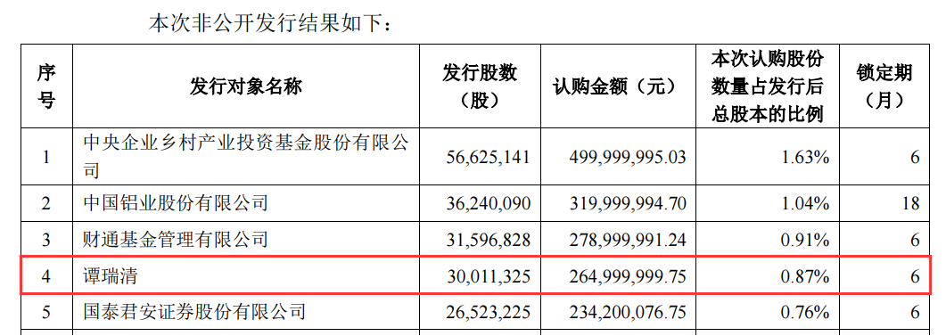 在云铝股份如此豪华的定增团中,出现了一位神秘自然人——谭瑞清。他不仅是17名投资者中唯一的自然人,且投资金额更是力压众多知名机构,位居第4,接近2.65亿元。