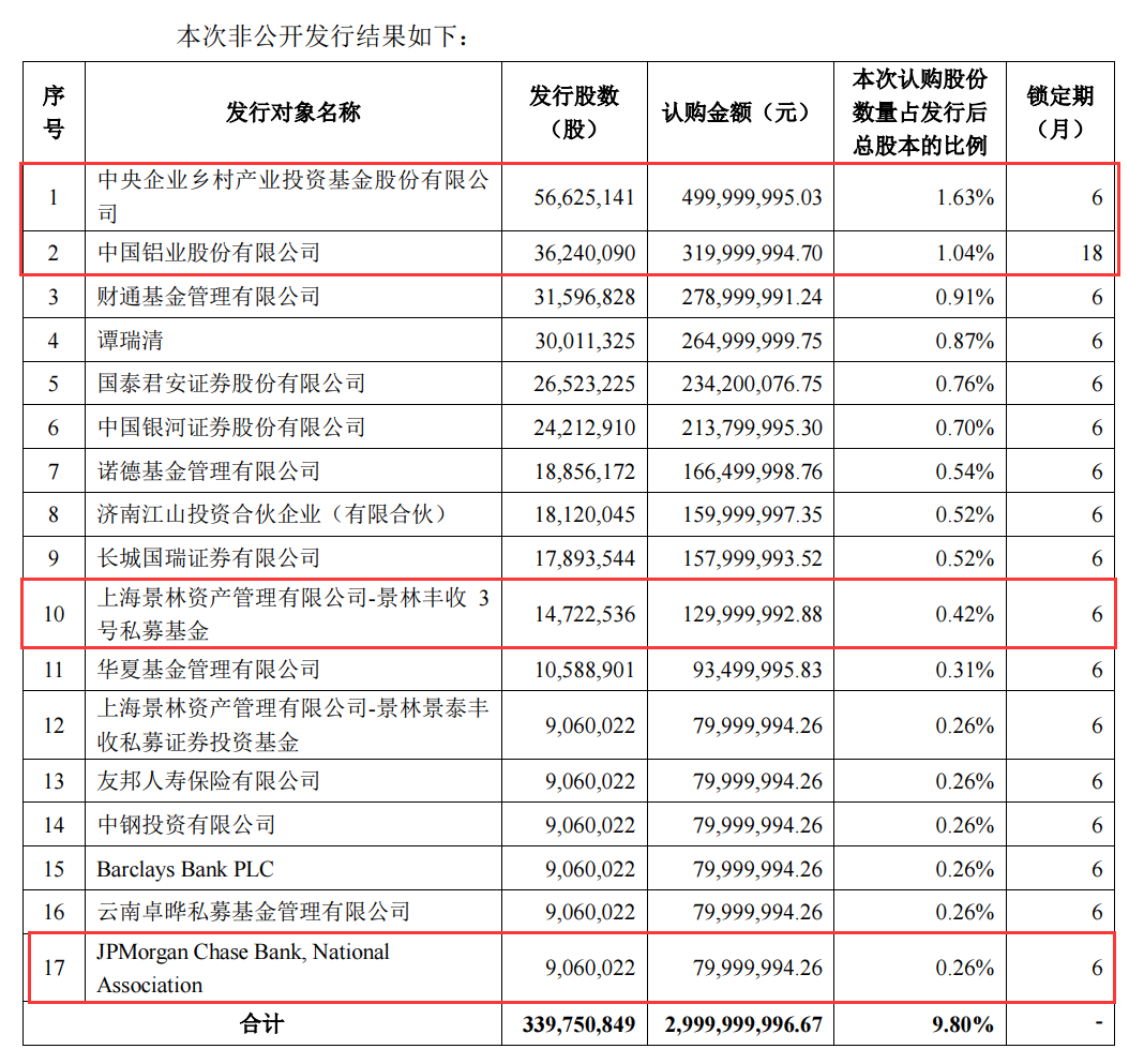 首先是“中”字头企业,中央企业乡村产业投资基金股份有限公司和中国铝业分别认购了5亿元和3.2亿元;