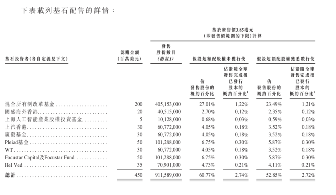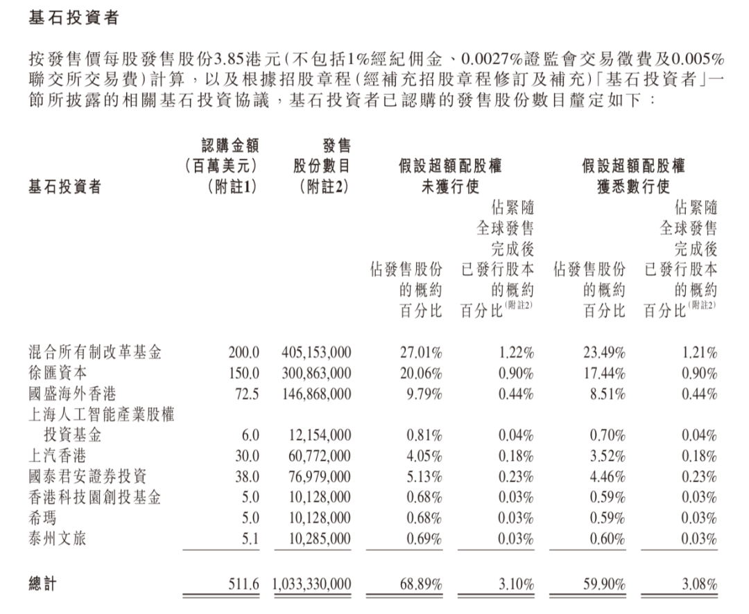 另外,按发售价每股3.85港元计算以及相关基石投资协议,基石投资者已认购约10.33亿股发售股份,相当于紧随全球发售完成后公司已发行股本约3.10%、全球发售项下发售股份数目的68.89%。