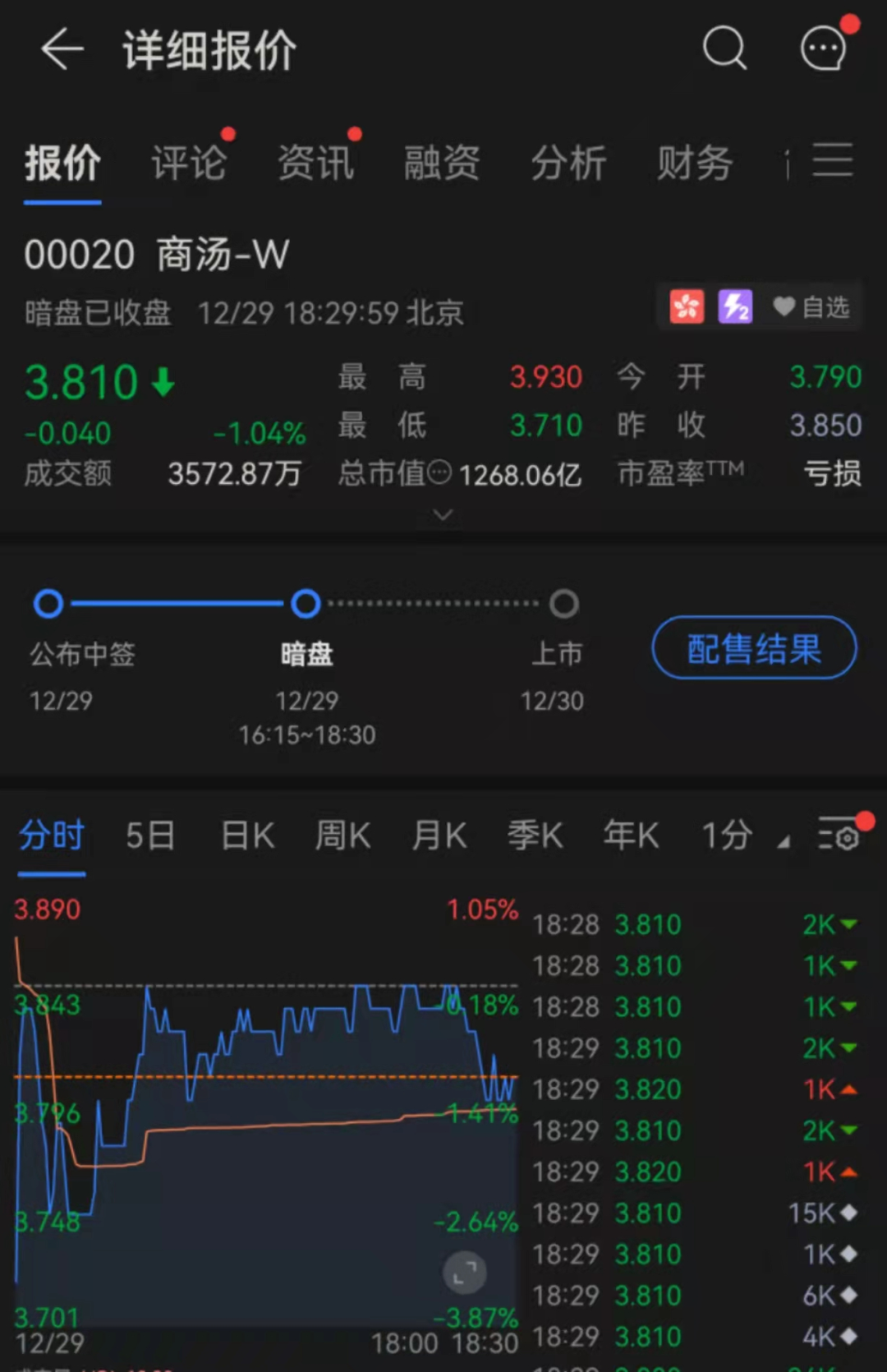 在12月29日的暗盘交易中,商汤-W出现破发。