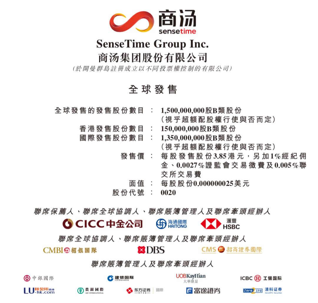 商汤-W在公告中表示,按发行价3.85港元计算,扣除包销佣金及公司就全球发售的其他估计开支后,公司将收取的全球发售所得款项净额约为55.52亿港元。